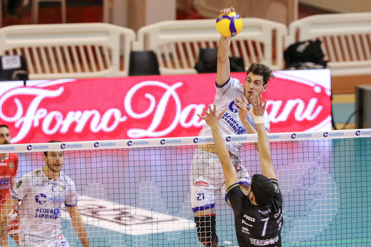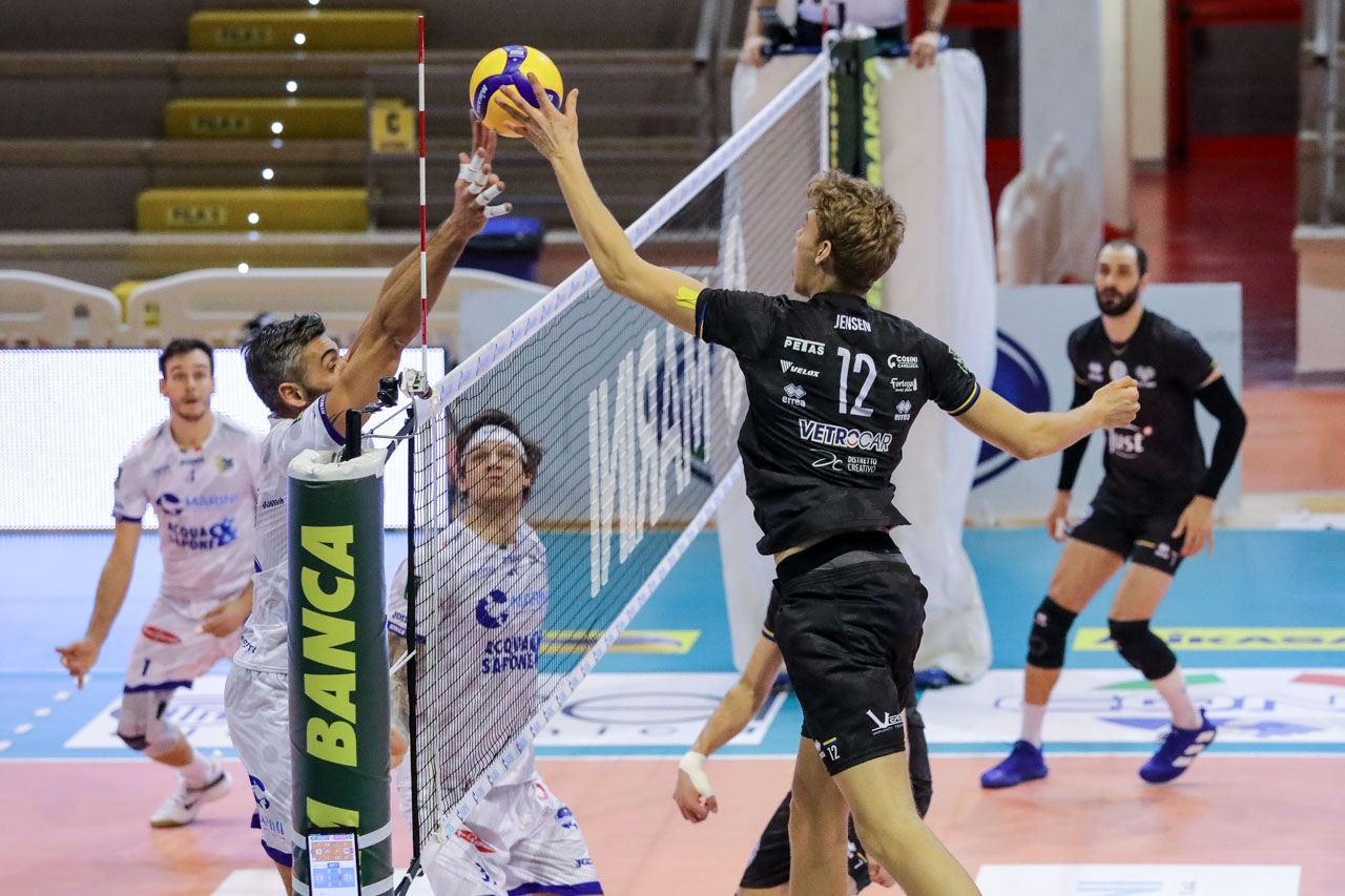 Senza Seganov impegnato con la Bulgaria e con Tillie ancora in ripresa dopo l’infortunio alla caviglia, in avvio Kovac propone Sottile in regia con Sabbi opposto, di banda Cavuto e Randazzo, al centro Szwarc e Krick con Cavaccini libero, poi nel corso della partita il tecnico dei pontini ha ridisegnato la squadra proponendo Szwarc opposto al posto di Sabbi e cambiando Tillie con Randazzo. Dall’altra parte della rete i veronesi si sono presentati senza Asparuhov, anche lui con la Bulgaria, e con il palleggiatore Spirito infortunato, al suo posto ha giocato l’ex Peslac.